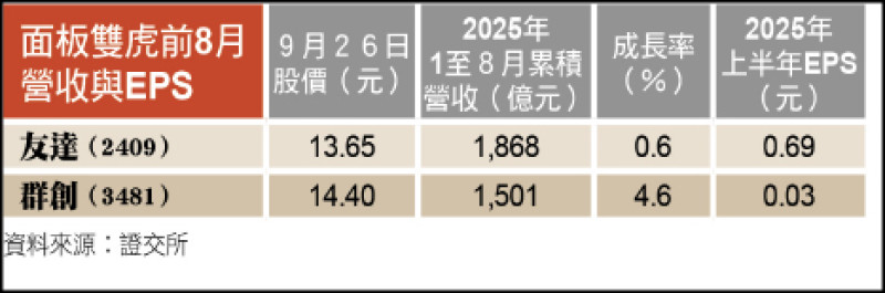 面板雙虎前8月營收與EPS