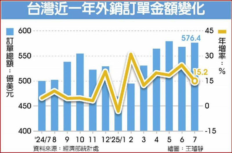 台灣經濟數據展現強勁韌性。外銷訂單已連續6個月年增,7月金額達576億美元,創歷年同月新高,主計總處修正今年全年經濟成長率為4.45%,位居主要經濟體前段。