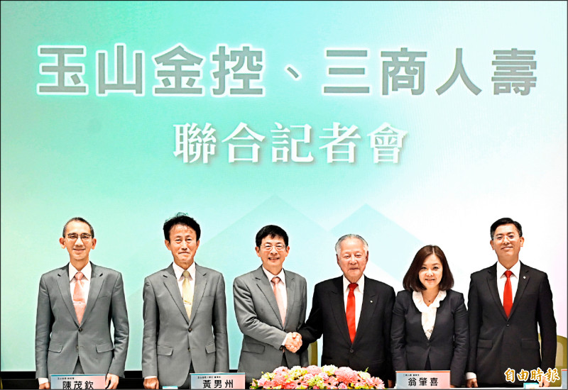 玉山金控合意併購三商人壽記者會,玉山金控董事長黃男州(左3)、三商人壽董事長翁肇喜(左4)等人,一同出席。(記者王藝菘攝)
