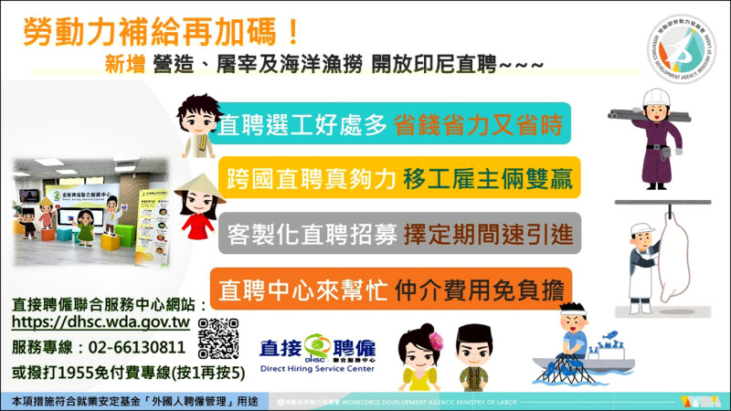 〔記者李靚慧/台北報導〕勞動部二〇一九年起與印尼合作,陸續開放製造業、機構看護及農業可直聘專案選工,昨宣布擴大開放營造業、屠宰業及海洋漁撈業雇主,均可透過「直接聘僱聯合服務中心」單一窗口辦理專案選工;雇主不僅可節省仲介費用,更能利用直聘中心的雙語翻譯與專人服務,更快速、透明的選工。