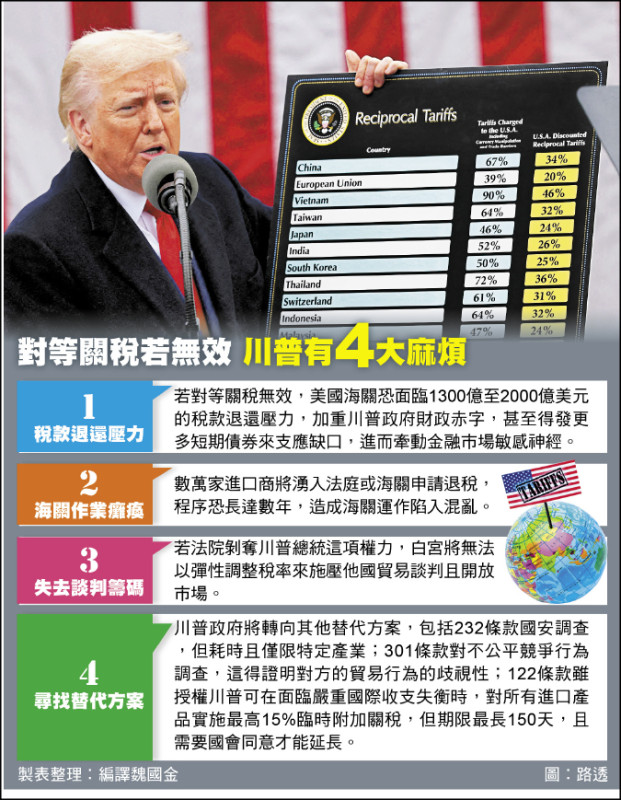 對等關稅若無效 川普有4大麻煩(製表整理︰編譯魏國金,圖︰路透)