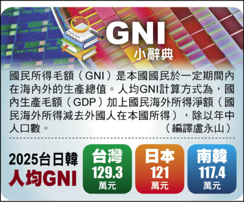 〔編譯盧永山/綜合報導〕南韓央行十日公布數據顯示,去年南韓人均國民所得毛額(GNI)為三萬六八五五美元(約一一七.四萬台幣),為連續第三年停留在三.六萬美元區間,低於日本的三.八萬美元(約一二一萬台幣)、台灣四萬五八五美元(約一二九.三萬台幣)。專家指出,台灣因受益於半導體產業蓬勃發展,因此國民所得大增。