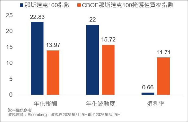 掩護性買權ETF透過持有股票或指數部位,同時賣出買權並收取權利金,以增加投資收益來源。由於多數資產仍配置於現貨資產,在權利金收入挹注下,部分產品具月配息及較高配息率的特色。相較單純持有股票資產,該策略在市場盤整或溫和上漲環境中可提供額外現金流,有助提升收益穩定度並降低投資組合波動。以那斯達克100指數及其相關掩護性買權指數為例,在掩護性買權策略帶動下,CBOE那斯達克100掩護性買權指數的年化波動度較那斯達克100指數降低,而殖利率則明顯提升,顯示此類策略有助降低投資組合波動並增加現金流。然而投資人亦需留意,在牛市環境下,由於賣出買權限制部分上漲空間,整體投資報酬可能相對受到壓抑。
