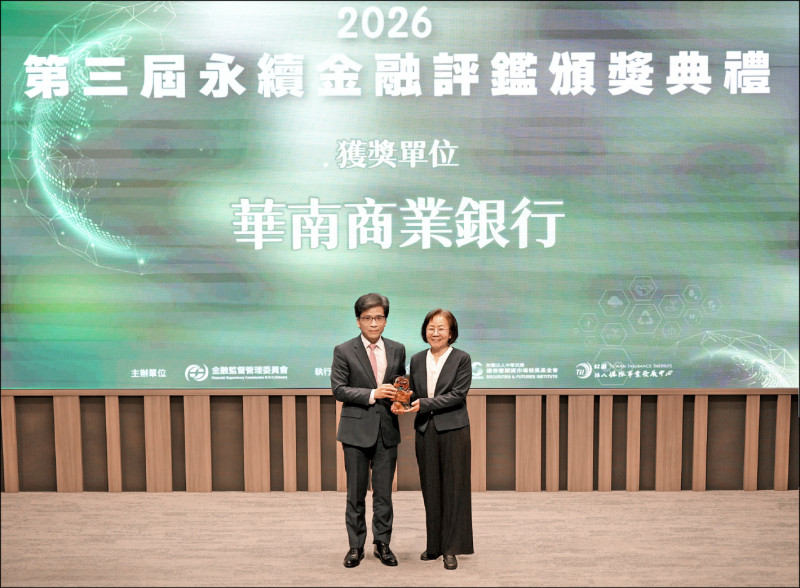 華南銀行榮獲「第三屆永續金融評鑑」前25%佳績,金管會主委彭金隆(左)頒獎給華南金控暨華南銀行董事長陳芬蘭(右)。(華南銀行提供)