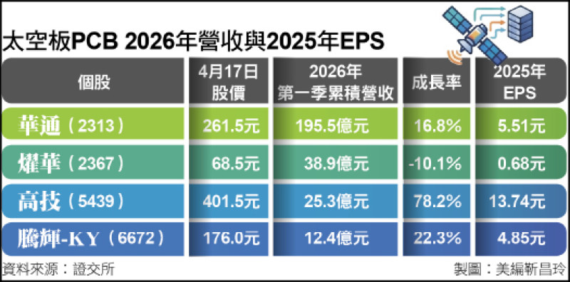 近兩年除了AI(人工智慧)為科技產業帶來驚人成長動能,低軌衛星(LEO)則是另一大新興產業,尤其AI算力與資料中心朝太空發展,更讓低軌衛星產業熱度大增,台灣PCB業者中以華通(2313)最早切入低軌衛星太空板,並享有獨佔地位,燿華(2367)耕耘低軌衛星也有多年時間,騰輝-KY(6672)、高技(5439)最近也打進低軌衛星供應鏈,成為相關公司未來營運重要成長主力。