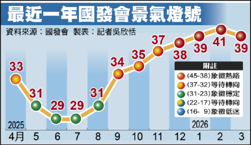 〔記者吳欣恬/台北報導〕國發會公布三月景氣對策信號綜合判斷分數為三十九分、連亮第四顆紅燈,但較二月減少二分,為去年六月以來首度下滑。國發會表示,主因春節效應消退使服務業加班工時較上月減少,以及中東局勢動盪衝擊製造業信心。