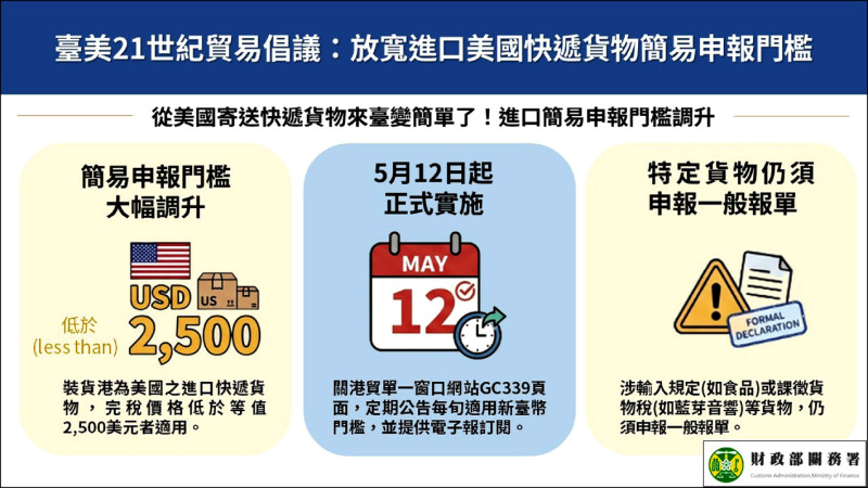 關務署說明,根據「空(海)運快遞貨物通關辦法」規定,完稅價格未逾新台幣五萬元,才可以簡易申報單辦理通關。不過,「台美二十一世紀貿易倡議」首批協定於二〇二四年十二月十日生效,依規定應於協定生效後三年內,放寬自美國進口快遞貨物適用簡易申報門檻的限額為「低於二五〇〇美元」。因此,關務署修正「駐美國台北經濟文化代表處與美國在台協會關於台灣與美國間貿易協定通關作業要點」,自今年五月十二日起實施。